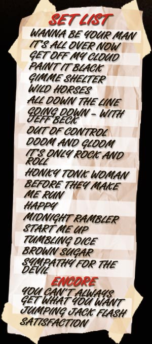 Right about now the Stones’ 50th anniversary shows in London should kick off. My man on the inside tells me that the set list so far: