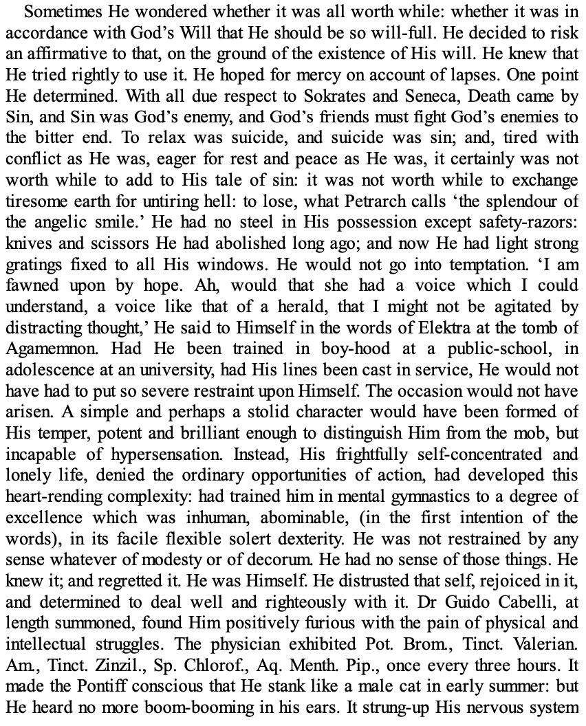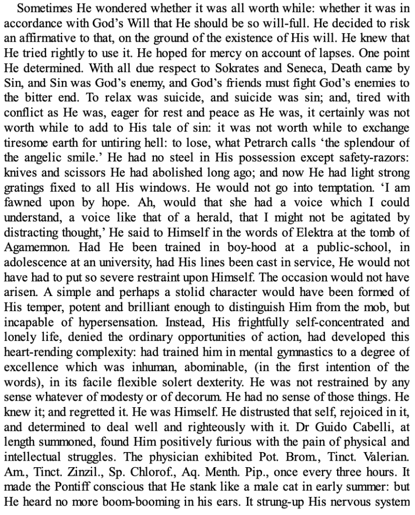 Hadrian the Seventh: extracts (16) April 10, 2021baron corvo baron corvoCatholicismFrederick Rolfehadrian the seventhShare this: Click to share on X (Opens in new window) X Click to share on Facebook (Opens in new window) Facebook Click to print (Opens in new window) Print Click to email a link to a friend (Opens in new window) Email More Click to share on Reddit (Opens in new window) Reddit Like Loading... Related